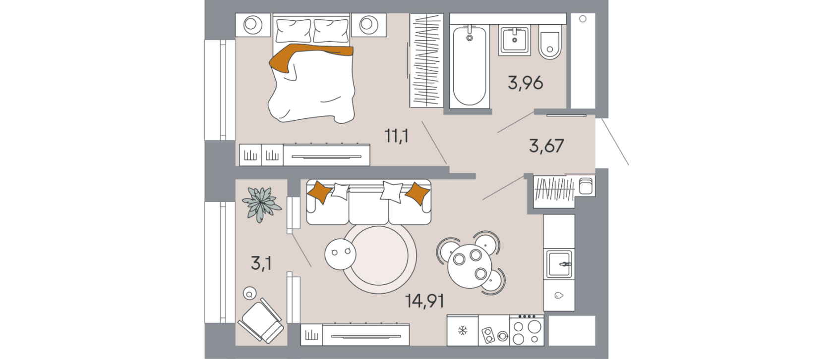 - Однокомнатные квартиры: от 34.81 м² – от 3 682 000 руб. – оптимальное решение для комфортного проживания одного человека или молодой пары.